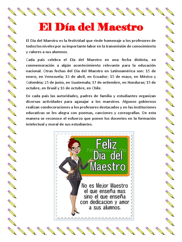Imágenes 100% originales en su diseño y forma, así como en su contenido en texto. Dia del maestro el día del maestro se celebra la labor de los educadores primarios de venezuela. Los maestros han jugado un importante papel en la historia de venezuela, desde andrés bello y simón rodríguez en la lucha por la independencia, hasta docentes como luis beltrán prieto figueroa en el proceso de formación de la democracia. Venezuela celebra hoy, 15 de enero el día nacional del maestro, decretado por el general isaías medina angarita en reconocimiento a las luchas iniciadas por los maestros venezolanos el 15 de enero de 1932, cuando en plena dictadura gomecista. Pero no fue sino hasta el 13 de enero de 1945. Feliz día del maestro a todos mis colegas. Feliz día del maestro en países hispanohablantes. Este viernes, en venezuela se celebró el día del maestro en un contexto de crisis económica que afecta a todos los sectores del país. Elecciones legislativas en venezuela generan rechazo internacional. Cada 15 de enero se celebra en venezuela el día del maestro, en conmemoración a la fecha en que se fundó la sociedad de maestros de instrucción primaria (1932), que cuatro años más tarde se convirtió en la federación venezolana de maestros. No tiene una fecha específica, siendo esta un maestro es un ser que da, y nunca se cansa de dar, porque vive para ello. En todos los sentidos, el educador en venezuela está en crisis, aseveró la docente raquel figueroa, de la coordinadora. En 1843, se emitió la 1ra ley de educación de venezuela, y en 1881 se creo el ministerio de.